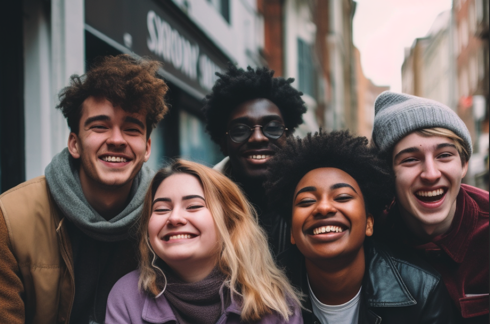 Ryhmä nuoria aikuisia hymyilee kameralle kaupungin kadulla, pukeutuneina talvivaatteisiin, taustalla rakennuksia ja abstrakti linjakuvio kuvan alareunassa.